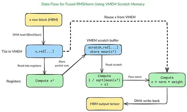写入)⟶ DMA 写回 ⟶ HBM。下图展示了同一过程。