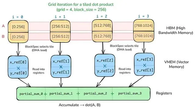 单个 grid 步骤中,数据在 TPU 内存层次结构中的流动路径为:HBM ⟶(BlockSpec 控制的 DMA 加载)⟶ VMEM ⟶ 寄存器(