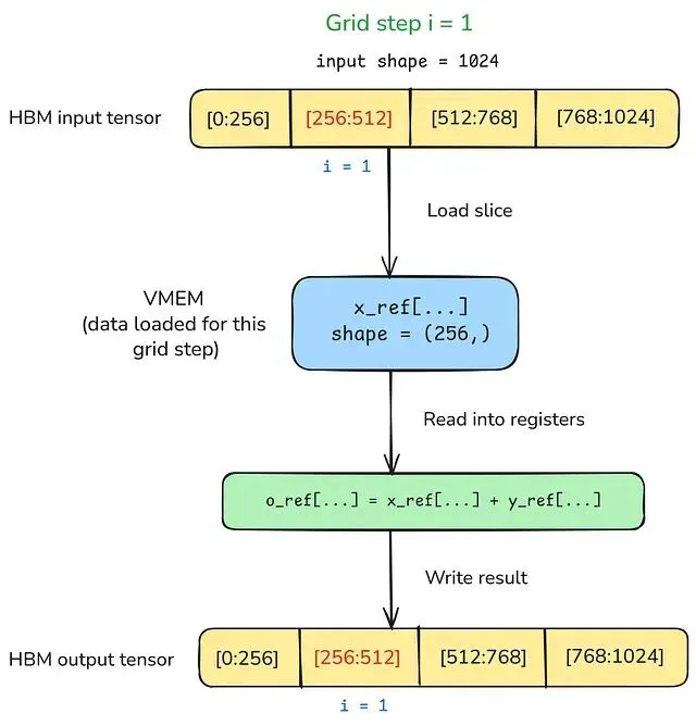 从 HBM 加载到 VMEM。 kernel 读取两个 ref 并相加,将结果写入输出 ref。四步完成后 HBM 中的输出张量包含完整的逐元素求和结果。