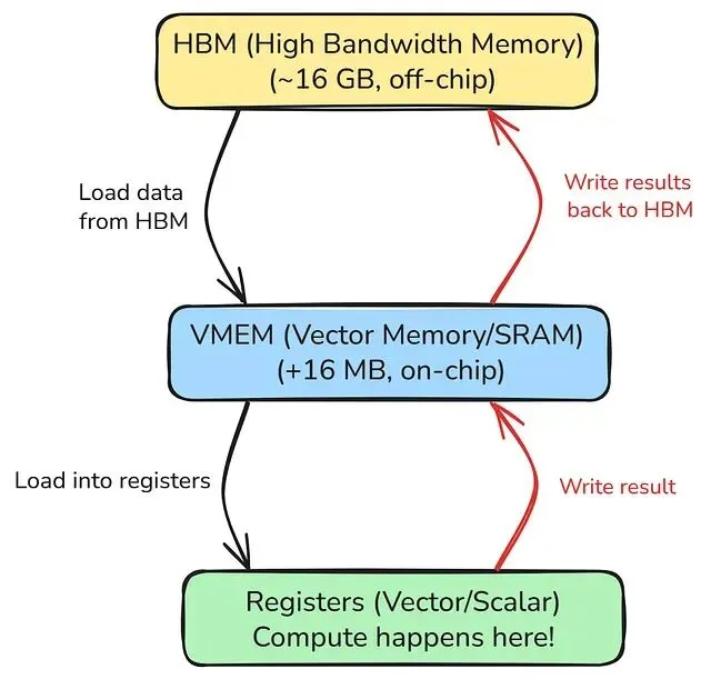 • 寄存器:算术运算实际发生的位置,值从 VMEM 加载到寄存器、完成计算后写回 VMEM。