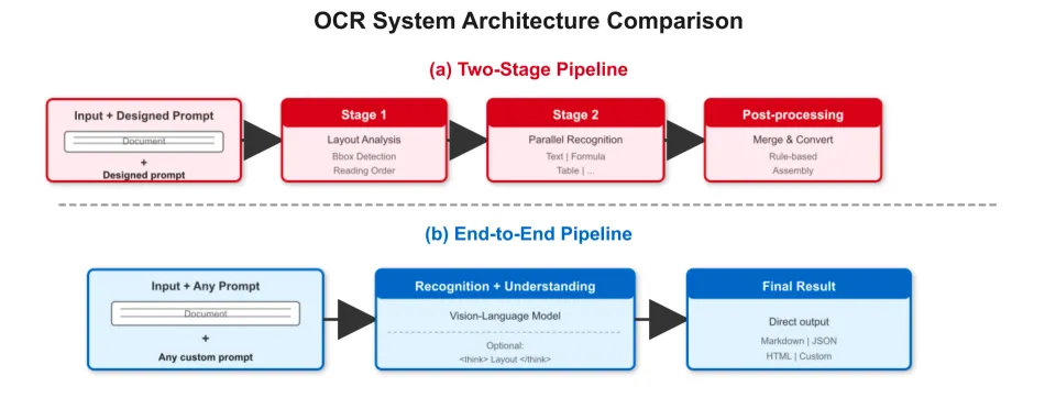 长期以来,工业级OCR系统大多沿用“检测—识别—理解”的三段式Pipeline架构:先通过检测模型定位版面元素,再由识别模型提取文本内容,最终借助大模型完成语义理解。这一模式在工程实践中已经非常成熟,但其本质仍是多阶段串联的处理流程。