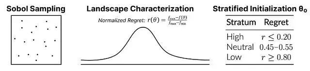 评估 agent 是否"智能",起始条件必须受控——一个足够好的初始配置会掩盖推理能力的不足。实验采用 Sobol 采样(256 种配置)对每个任务的性能曲面进行特征化,并从中选取三个分层起始点:低质量("Broken",底部 20%)、中等("Average",中间区域)、高质量("Pro",顶部 20%)。
