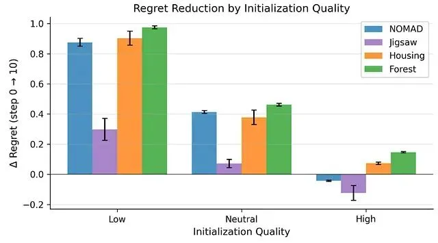 成功的最强预测因子不是 agent 做了什么,而是它从哪个配置出发。起点较差的 agent 快速改善后很快触顶;起点接近最优的改善幅度极小,在 NOMAD 基准上甚至出现退化。
