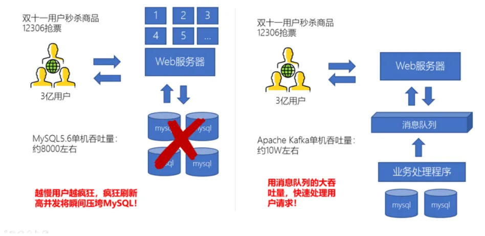 - 因为消息队列是低延迟、高可靠、高吞吐的,可以应对大量并发