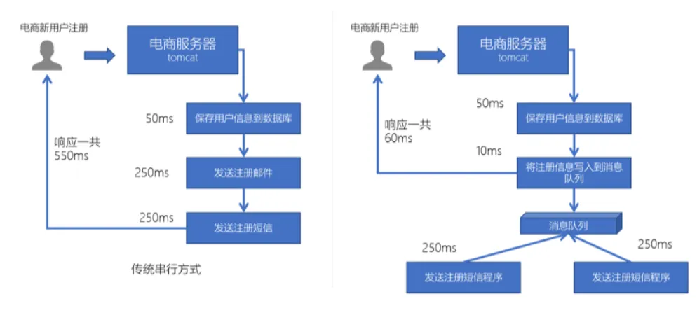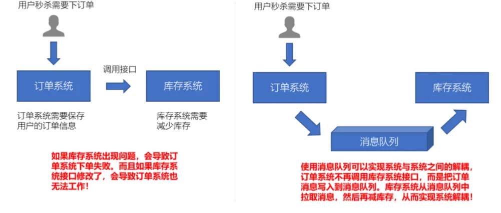 - 原先一个微服务是通过接口(HTTP)调用另一个微服务,这时候耦合很严重,只要接口发生变化就会导致系统不可用