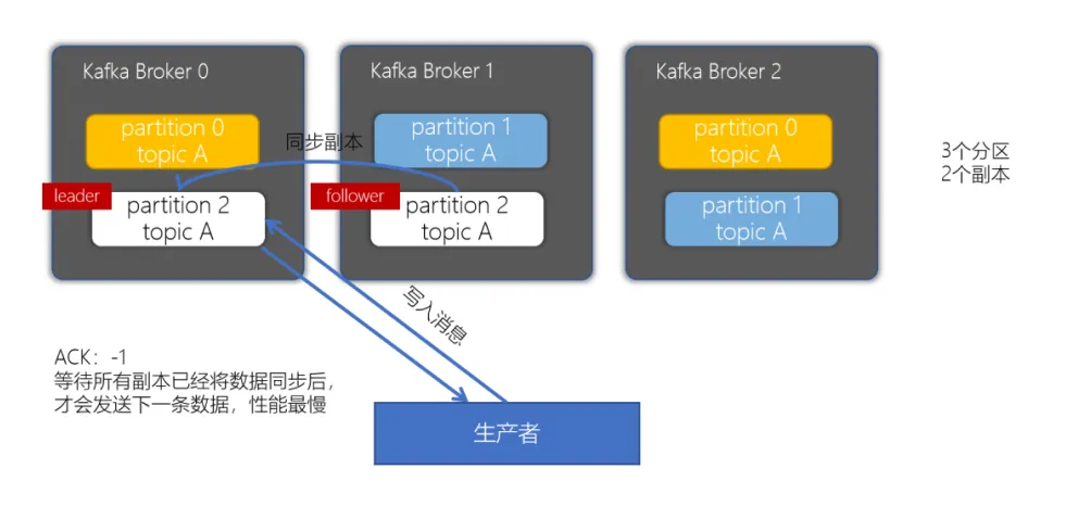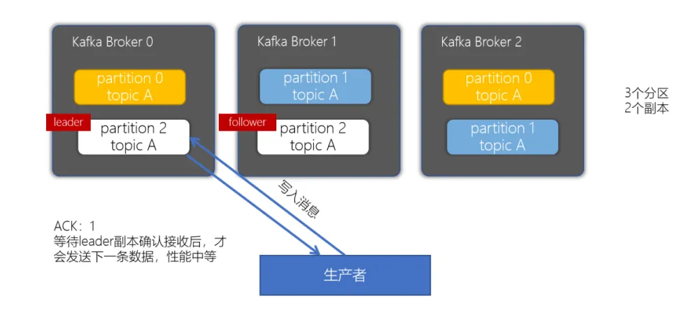 当生产者的ACK配置为1时,生产者会等待leader副本确认接收后,才会发送下一条数据,性能中等。