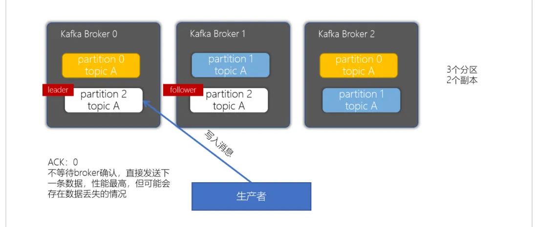 - 配置ACK影响要求为 0 时 —— 生产者只负责发送数据,不关心数据是否丢失(这种情