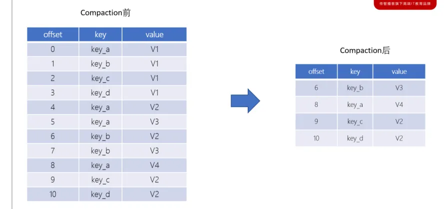 - 日志压缩(Log Compaction):按照消息的key进行整合,有相同key的但有不同value值,只保留最后一个版本。