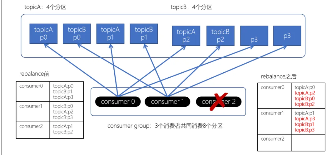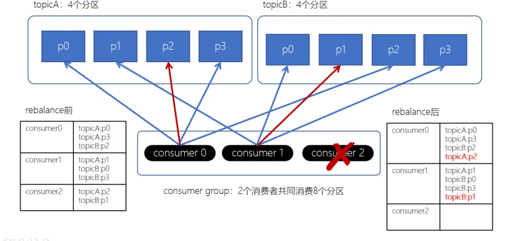上面如果consumer2崩溃了,此时需要进行rebalance。如果是Range分配和轮询分配都会重新进行分配,例如: 编辑