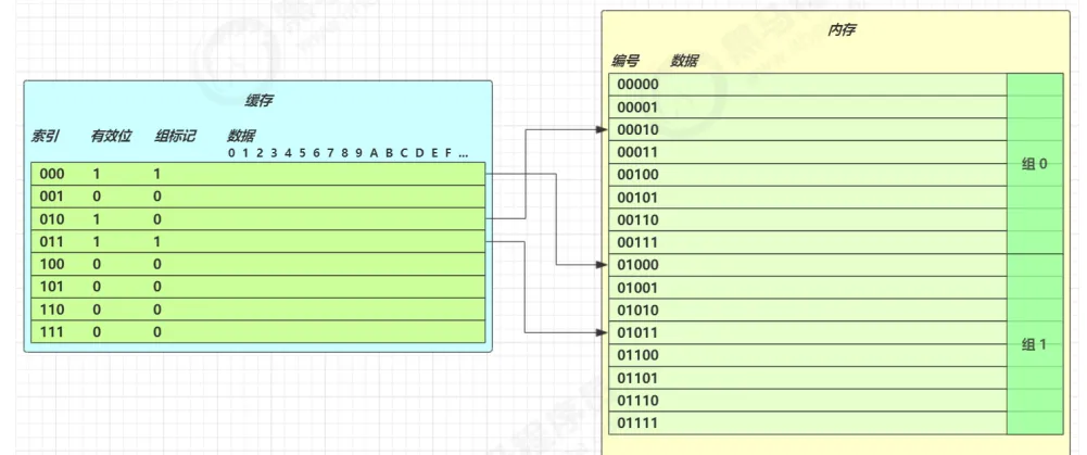 首先根据低位,计算在缓存中的索引,之后判断缓存是否有效。低位如果为0,去内存读取最新数据更新缓存行,为1则再对比高位组标记是否一致,如果一致,根据偏移量返回缓存数据,不一致,则去内存读取新数据并更新缓存行。