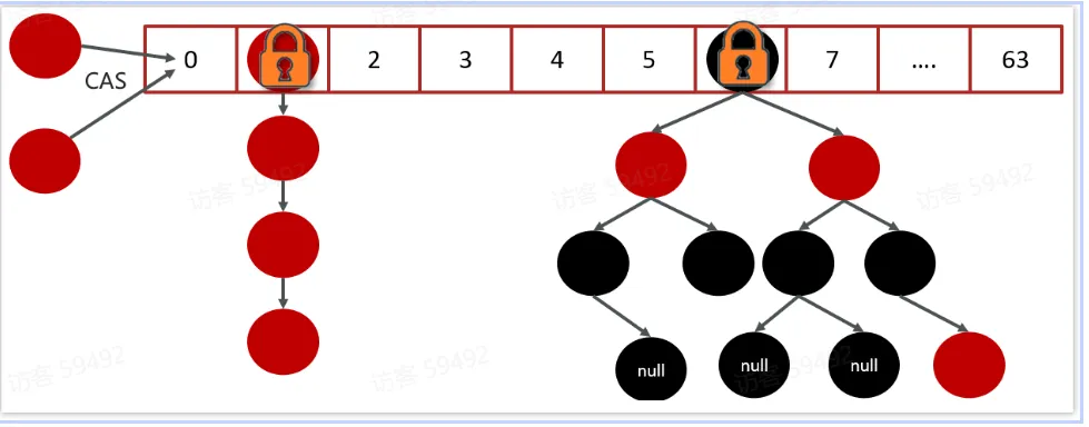 如果某个数组为空,此时有两个线程同时添加到同一个位置,那么通过CAS来确保添加的安全性,一个成功,另一个失败的话就会自旋尝试,然后添加到元素的后面。如果添加的时候首节点是有的,那么会对首节点上syn锁,确保并发安全