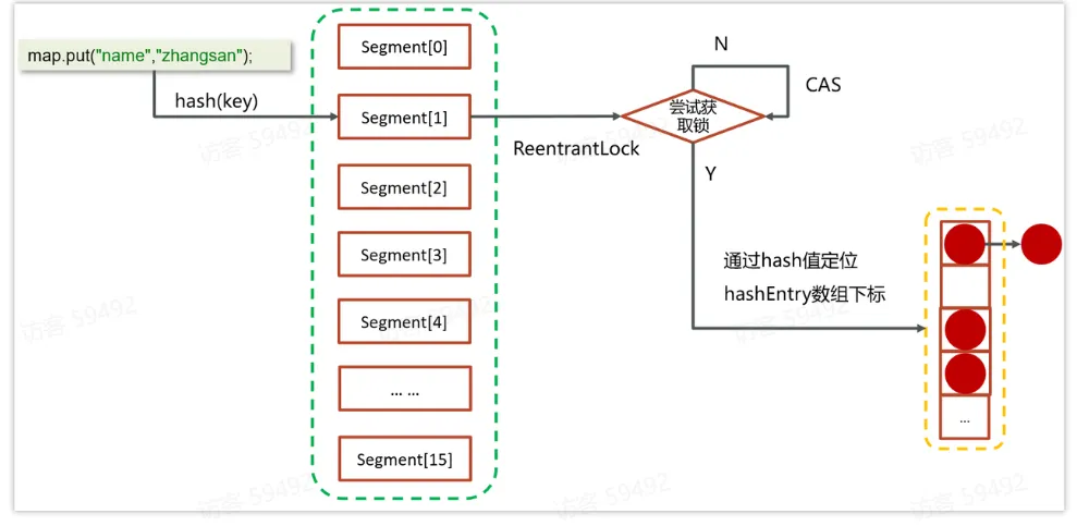 - 在进行操作数据的之前,会先判断当前segment对应下标位置是否有线程进行操作,为了线程安全使用的是ReentrantLock进行加锁,如果获取锁是被会使用cas自旋锁进行尝试