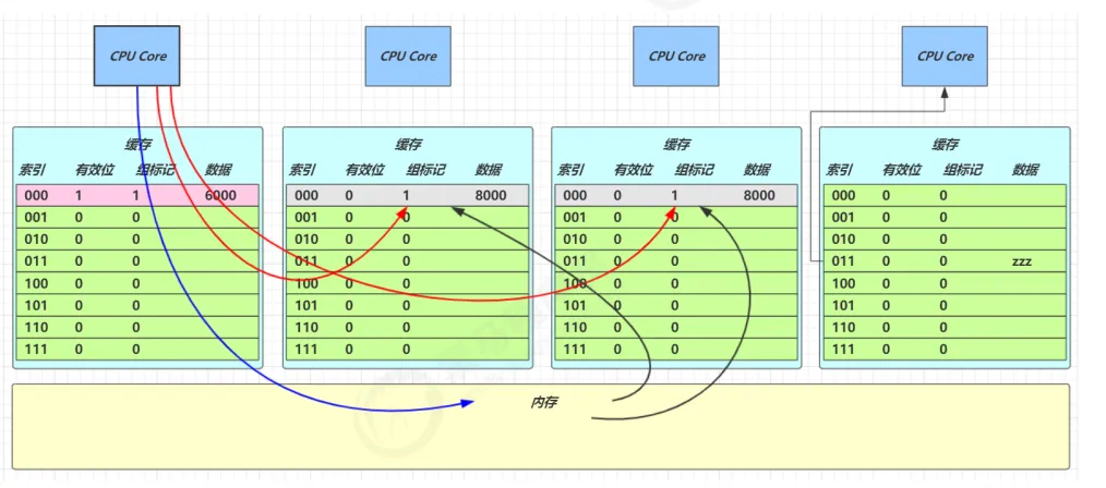 000行是 E 状态(有效位 1,组标记 1,数据 6000),其他核心都是 I - 核心 2 要读