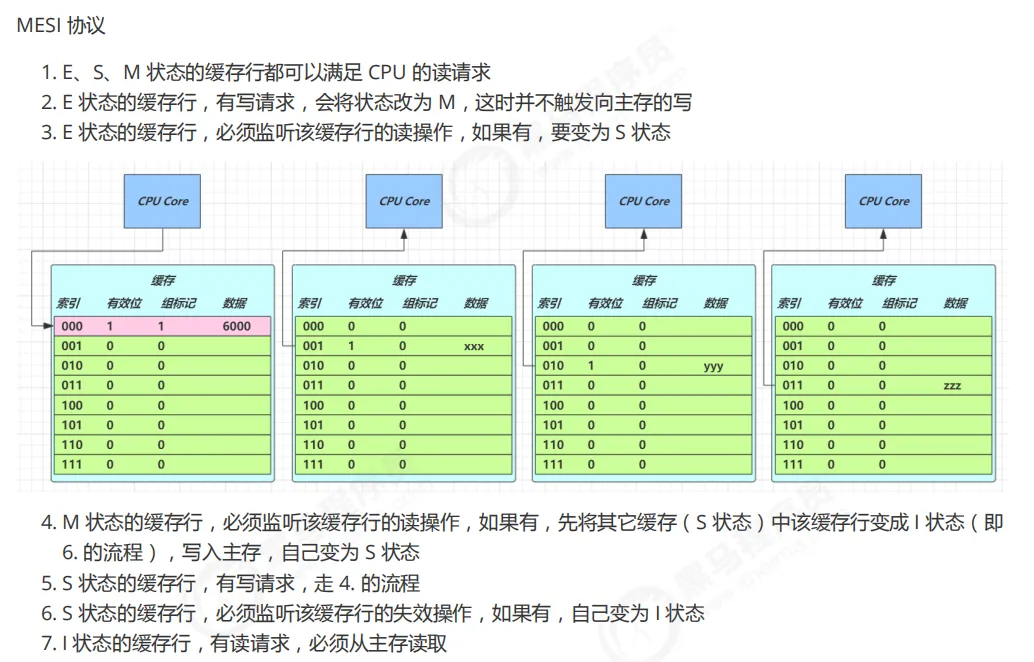 - M 状态:听到别的核心要读我这份数据 → 先写回内存,再大家都变成 S(规则 4)