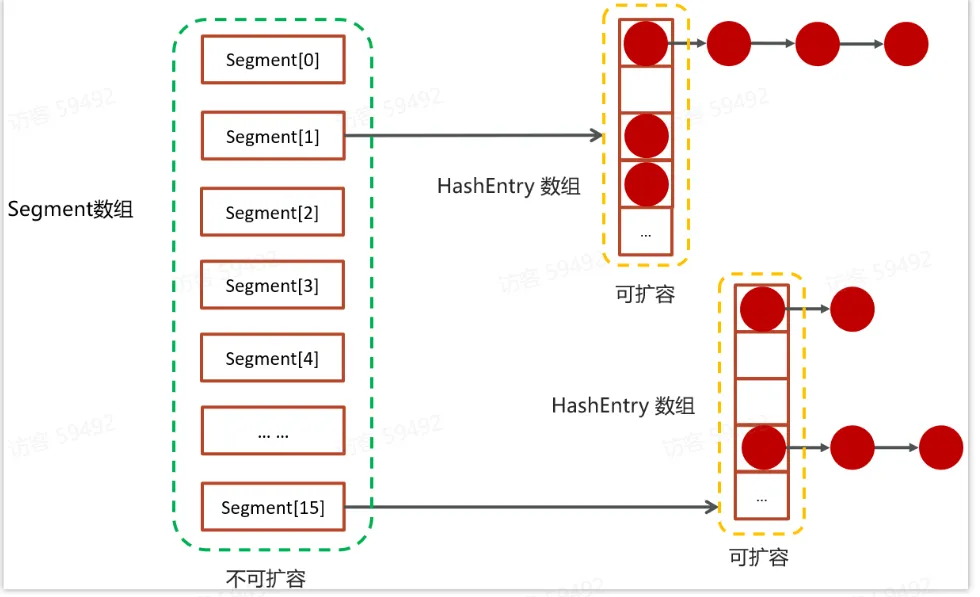 - 在每个segment中都可以挂一个HashEntry数组,数组里面可以存储具体的元素,HashEntry数组是可以扩容的