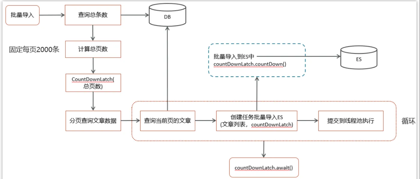 在我们项目上线之前,我们需要把数据库中的数据一次性的同步到es索引库中,但是当时的数据好像是1000万左右,一次性读取数据肯定不行(oom异常),当时我就想到可以使用线程池的方式导入,利用CountDownLatch来控制,就能避免一次性加载过多,防止内存溢出