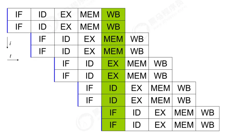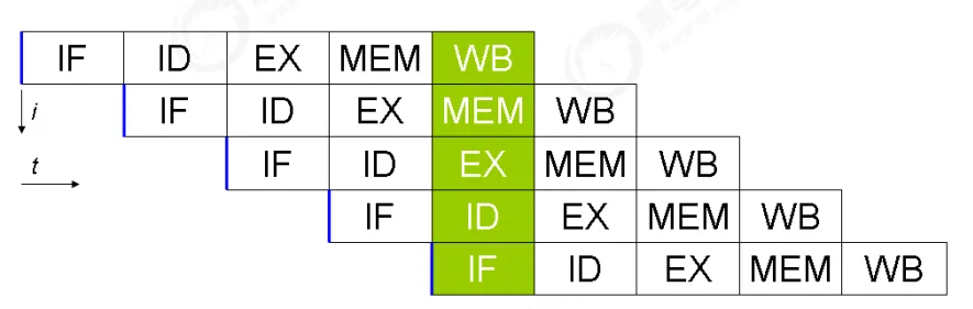 现代 CPU 支持多级指令流水线,例如支持同时执行 取指令 - 指令译码 - 执行指令 - 内存访问 - 数据写回的处理器,就可以称之为五级指令流水线。这时 CPU 可以在一个时钟周期内,同时运行五条指令的不同阶段(相当于一条执行时间最长的复杂指令),IPC = 1,本质上,流水线技术并不能缩短单条指令的执行时间,但它变相地提高了指令地吞吐率。