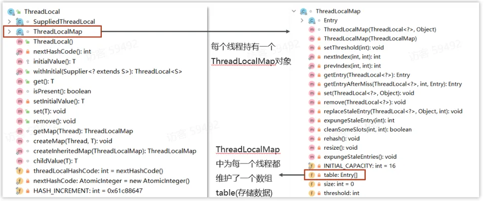 在ThreadLocal中有一个ThreadLocalMap内部类(ThreadLocalMap属于Thread,而不是属于ThreadLocal),每个线程持有一个ThreadLocalMap对象,在这个内部类中有一个属性为table的数组,这个是真正存数据的地方。