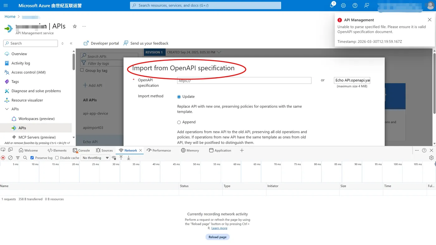 【Azure APIM】API导入功能报错 Unable to parse specified file.