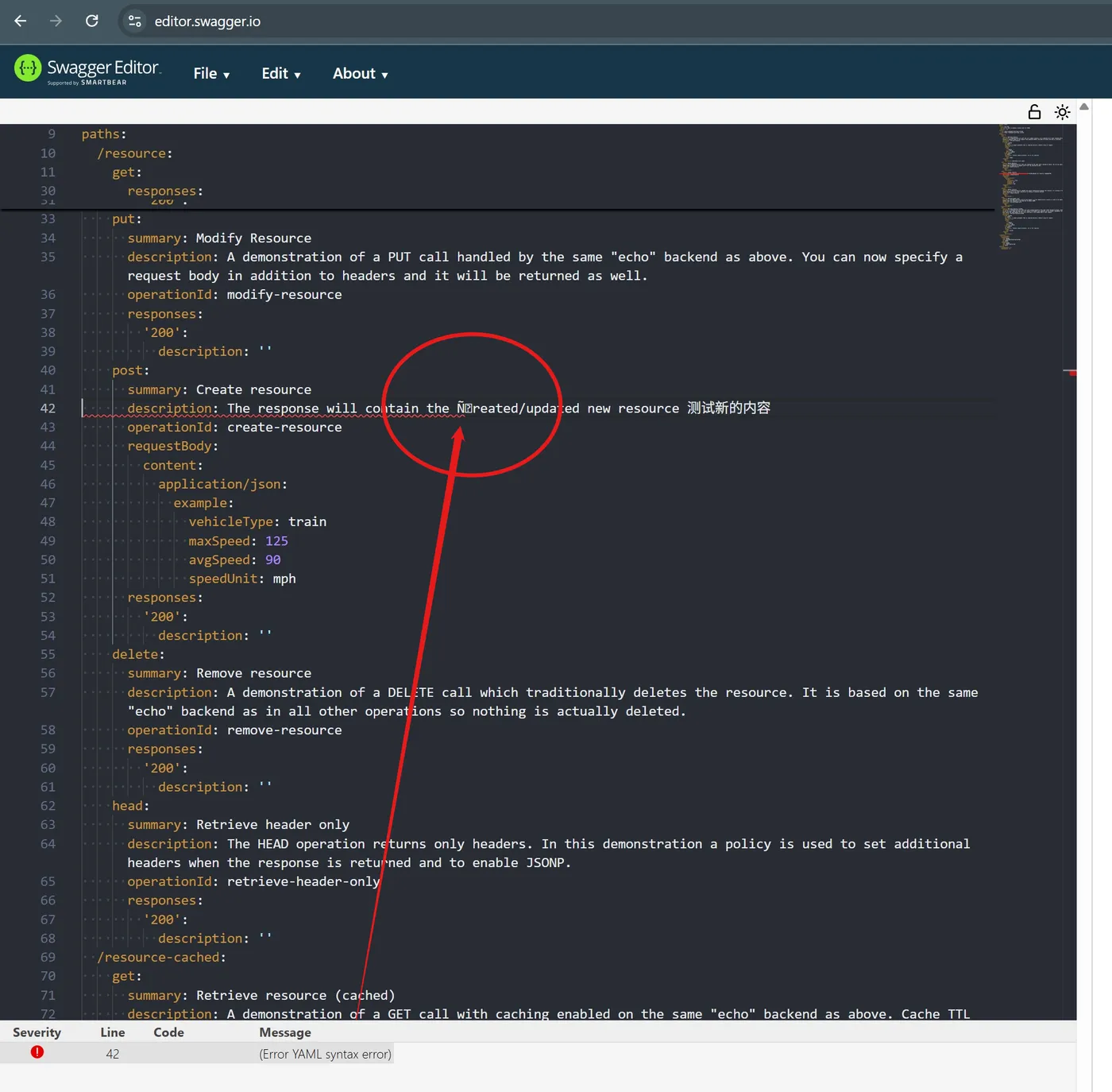 Swagger Editor 在此不仅用于格式校验,更重要的是它会显式暴露不可见或非法字符,这是 Portal 和 CLI 错误信息中缺失的关键线索。