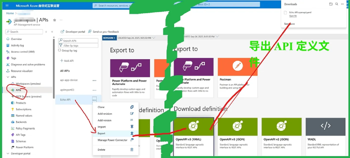 在APIM的API操作页面,为了备份API的所有配置信息,先使用导出功能把API导出为OpenAPI(YAML)文件。