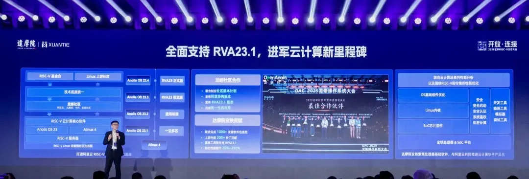 Anolis OS 23 系列版本的发布,达摩院玄铁团队贡献卓著:协助完成超 1000 个关键软件包选型;在内核层贡献超 200 项特性,包括在工具链(GCC、LLVM)、Java 等领域成果突出;高性能库性能提升超 200%。在 2025 龙蜥操作系统大会上,达摩院荣获"最佳合作伙伴"奖,马涛表示,期待未来继续与达摩院共建 RISC-V 软硬件生态。