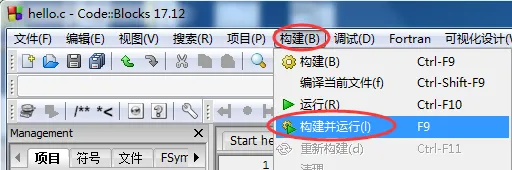 在上方菜单栏中选择 构建 --> 构建,就可以完成 hello.c 的编译工作。