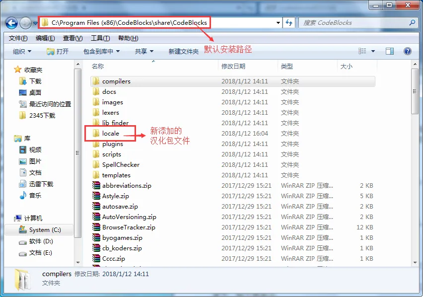 2) 进入 CodeBlocks 安装目录(其默认安装目录为 C:\Program Files (x86)\CodeBlocks),依次进入 share --> CodeBlocks 文件夹,然后将解压汉化包得到的 locale 文件夹,复制到 CodeBlocks 文件夹下,如下图所示: