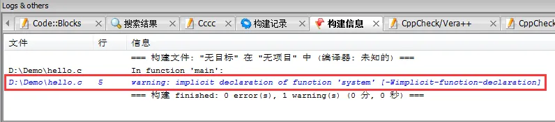 system("pause"); 语句的作用就是让程序暂停一下。注意开头部分还添加了 #include<stdlib.h> 语句,否则当你重新编译时,构建信息窗口会提示有关 system函数的警告,如下图所示: