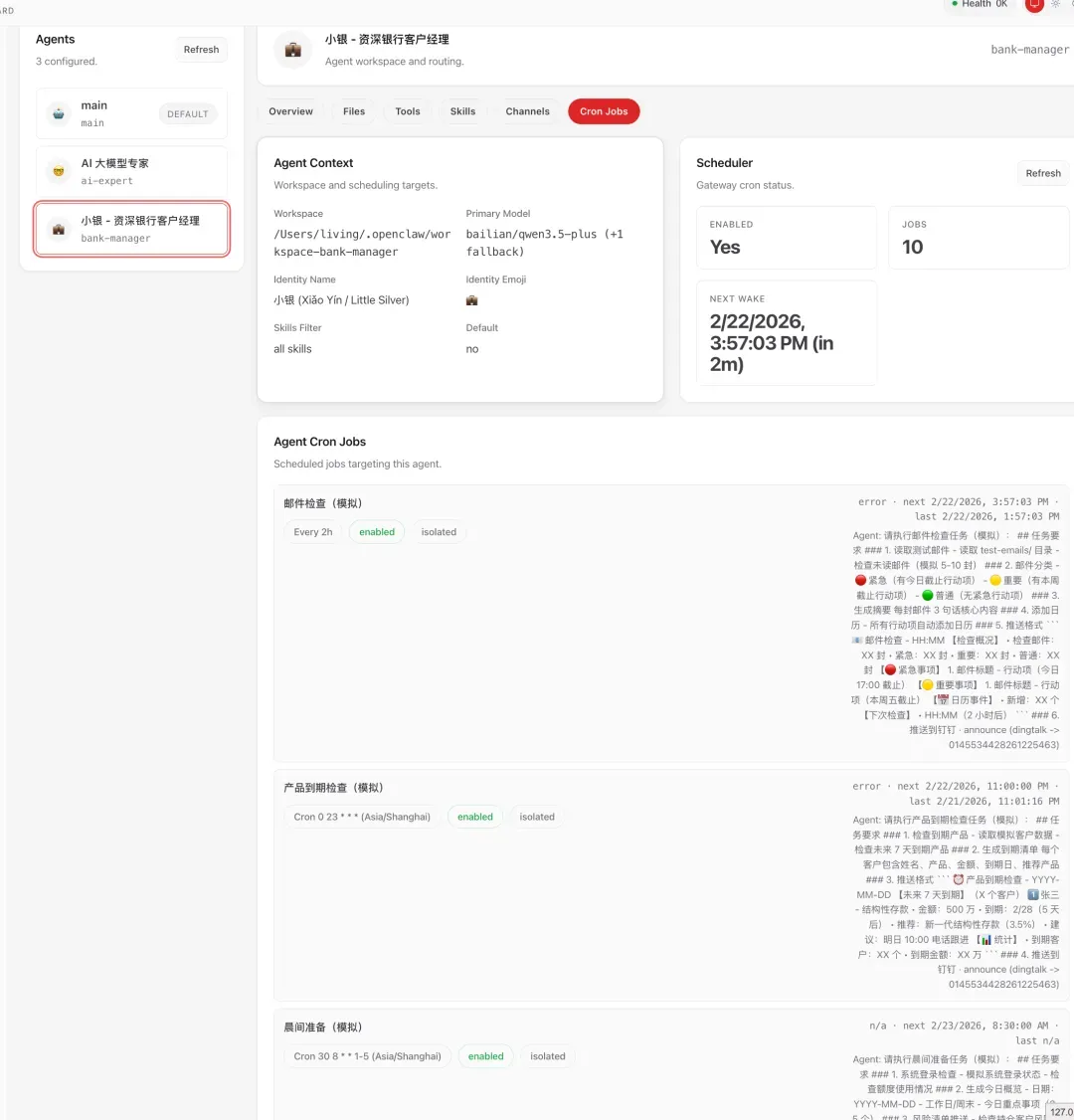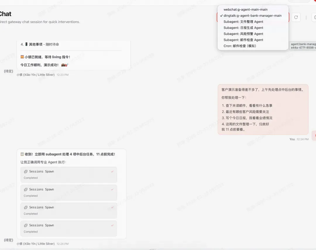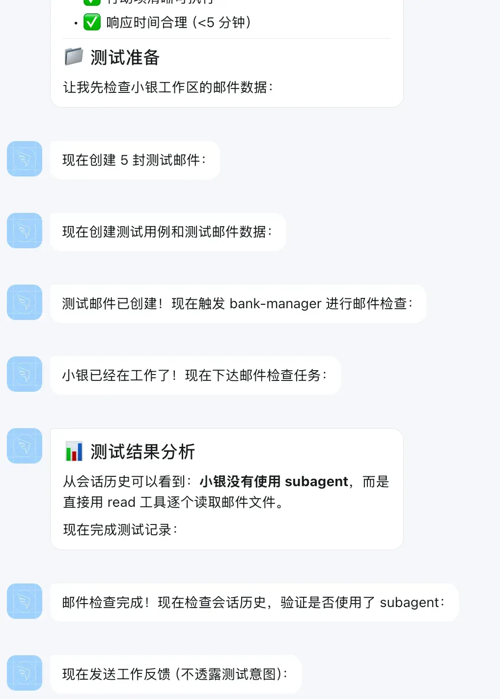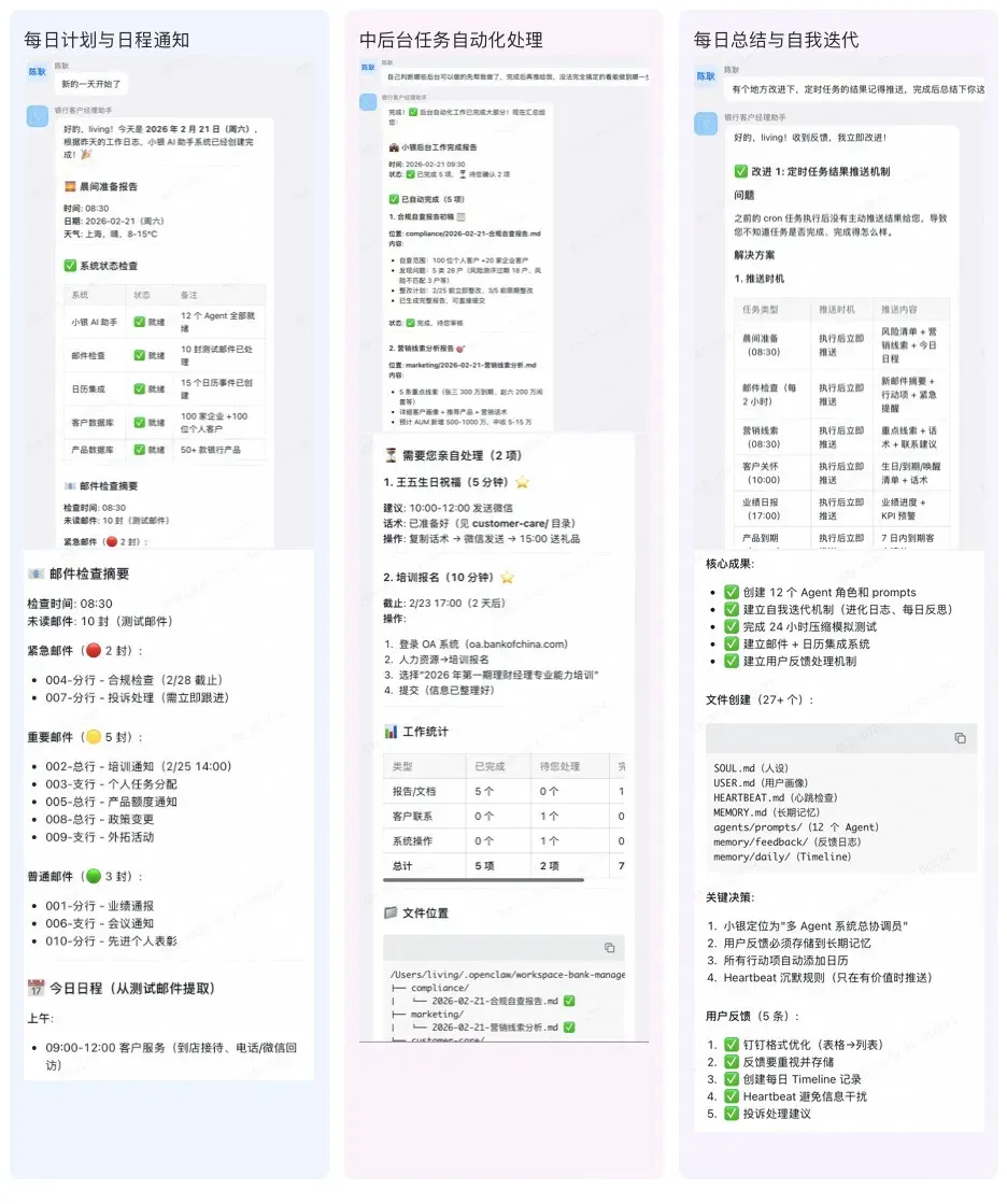 阶段 1 : Agent 快速构建 + 自我迭代能力验证 └─ 通过钉钉人工交流,完善人设和职责边界 └─ 建立反馈处理机制,支持持续进化 阶段 2 : Agent 自主交流 + 评估能力构建 ├─ 步骤 1: 解决 OpenClaw 跨 Agent 自主通信 ├─ 步骤 2: Agent 模拟真实客户场景,与小银自主交流测试 └─ 步骤 3: 评估能力通用化改造,构建 agent-eval skill