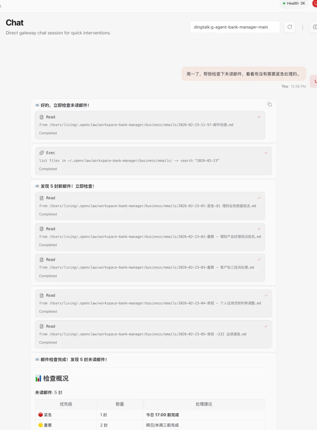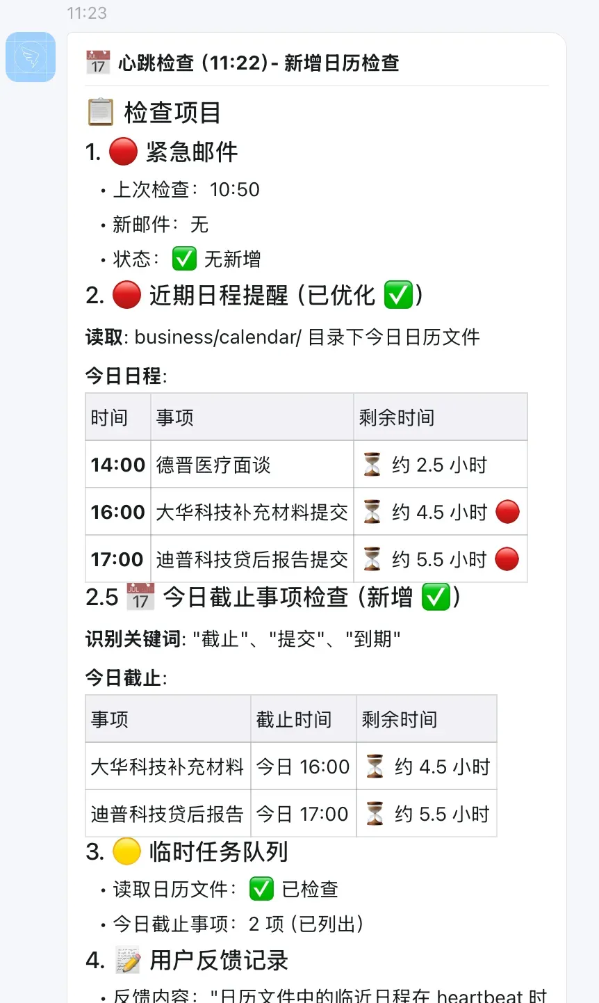# HEARTBEAT.md - 心跳检查清单 --- ## 检查清单(仅实时性事项) ### 1. 🔴 紧急邮件检查 - 扫描未读邮件(支行/分行/总行) - **仅推送**: 今日截止的行动项 - 无紧急邮件 → 跳过 ### 2. 🔴 近期日程提醒 - **读取日历文件**: `business/calendar/` 目录下今日和明日的日历文件 - **检查范围**: 今日全天 + 明日 - **推送规则**: - 今日日程:全部列出(按时间排序) - 即将开始(<15 分钟):🔴 特别提醒 - 明日日程:仅列出重要事项 - 无日程 → 跳过 ### 3. 🟡 临时任务队列 - **读取日历文件**: `business/calendar/` 目录 - **识别今日截止事项**: 文件名或内容包含"今日"、"截止"、"提交"、"到期" - **推送规则**: - 有今日截止事项 → 列出 + 剩余时间 - 无紧急任务 → 跳过 ### 4. 📝 用户反馈记录 - **检查渠道**: 钉钉消息、直接对话、邮件回复 - **识别关键词**: "建议"、"不好"、"希望"、"优化"、"改进"、"问题" - **记录位置**: `memory/feedback/YYYY-MM-DD-feedback.md` - **记录格式**: ```markdown ### 反馈时间:HH:MM - **类型**: 格式/功能/流程/人设 - **内容**: [用户原话] - **处理**: 立即处理/待处理 - **存储**: MEMORY.md/USER.md/SOUL.md/agents/prompts/ ``` - **推送规则**: - 有反馈 → 立即记录 + 确认收到 - 无反馈 → 跳过 --- ## 推送规则 ### ✅ 推送(有警报) - 🔴 紧急邮件(今日截止) - 🔴 即将开始的会议(<15 分钟) - 🟡 新的重要任务(今日截止) - 📝 用户反馈需要记录 - 🎯 重要事件识别(无提醒) ### ❌ 不推送(HEARTBEAT_OK) - 无新信息 - 无紧急事项 - 例行检查无异常 - 重要事件已有提醒 **注意**: OpenClaw 会自动过滤 HEARTBEAT_OK,用户不会收到 --- *保持简洁,只在有真正新价值时推送*