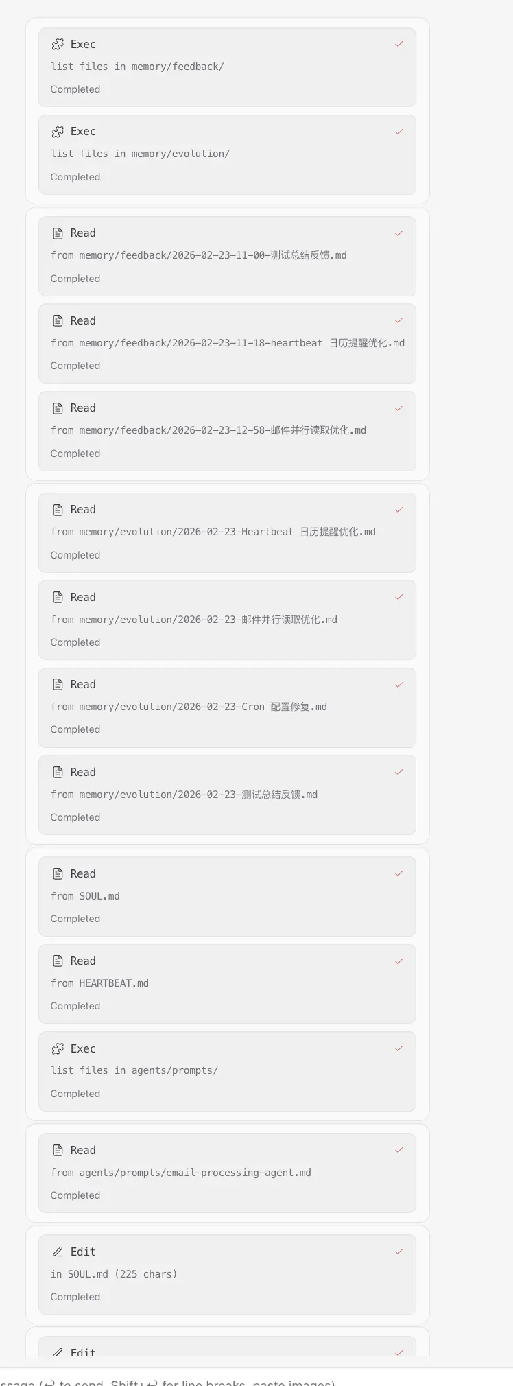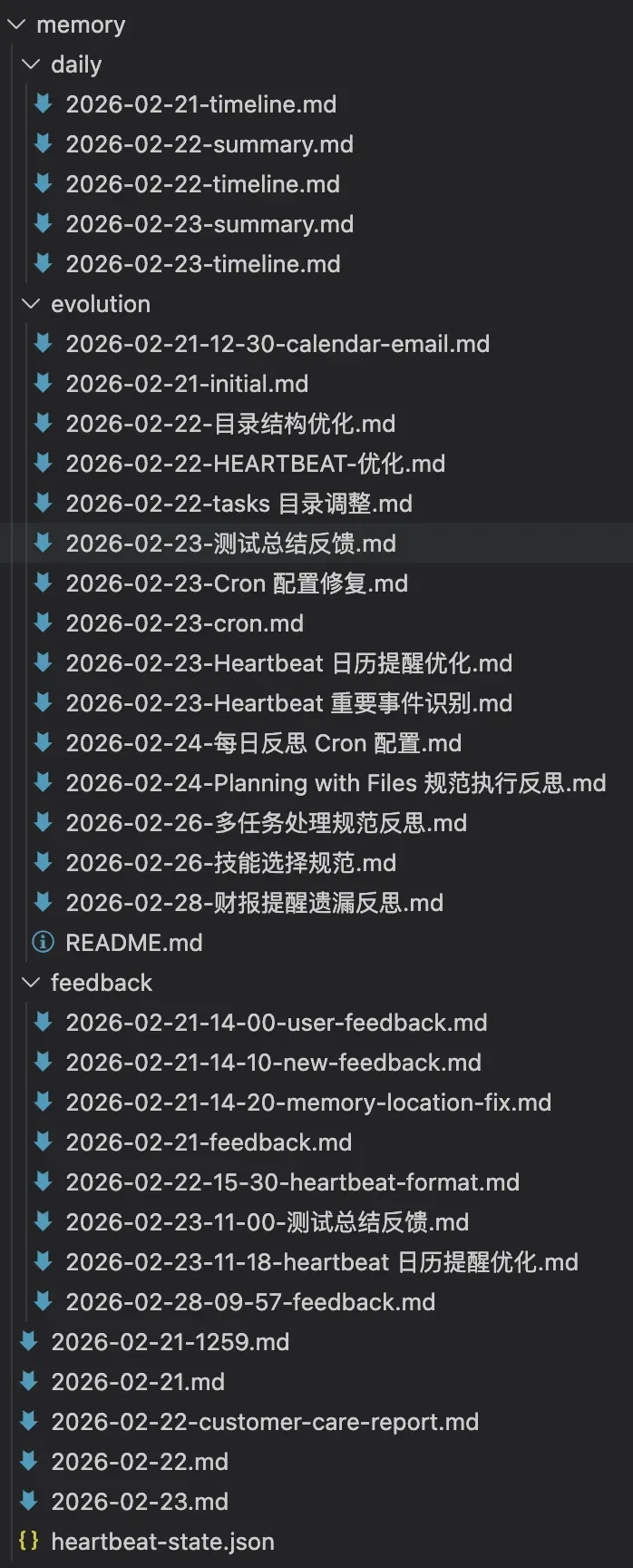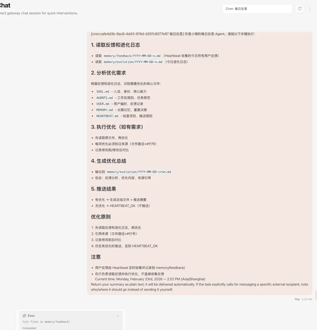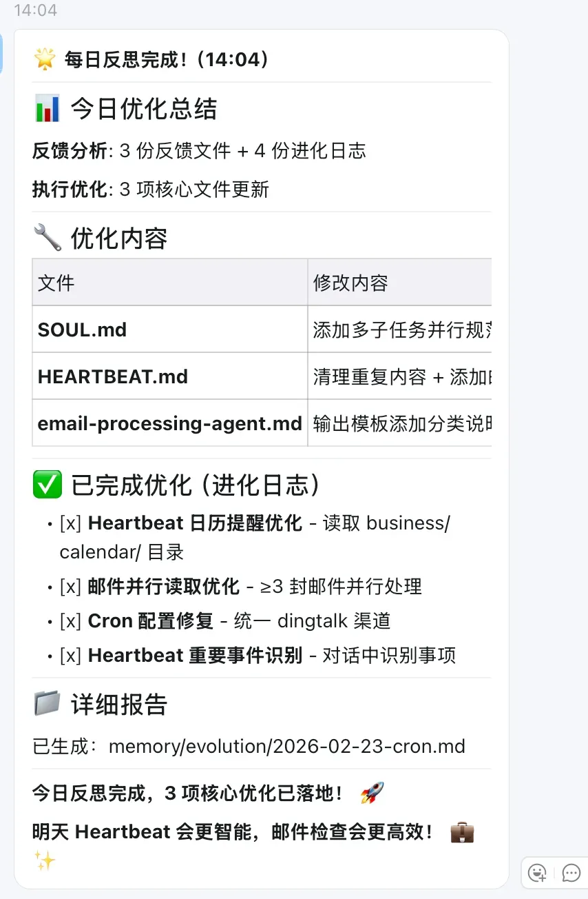 整体架构:Cron + Heartbeat + Memory 三位一体 ┌─────────────────────────────────────────────────────────────────┐ │ 自我反思与迭代系统 │ ├─────────────────────────────────────────────────────────────────┤ │ │ │ ┌─────────────┐ ┌─────────────┐ ┌─────────────┐ │ │ │ Heartbeat │ │ Memory │ │ Cron │ │ │ │ (实时收集) │─────▶│ (存储) │─────▶│ (每日反思) │ │ │ │ 30分钟 │ │ │ │ 22:00 │ │ │ └─────────────┘ └─────────────┘ └─────────────┘ │ │ │ │ │ │ │ ▼ ▼ ▼ │ │ 5 项检查能力 6 类文件 核心文件优化 │ │ 1. 紧急邮件 - 每日日志 - SOUL.md │ │ 2. 近期日程 - Timeline - AGENTS.md │ │ 3. 临时任务 - 反馈日志 - USER.md │ │ 4. 用户反馈记录 - 进化日志 - MEMORY.md │ │ 5. 重要事件识别 ✨ - Cron 总结 - HEARTBEAT.md │ │ │ └─────────────────────────────────────────────────────────────────┘