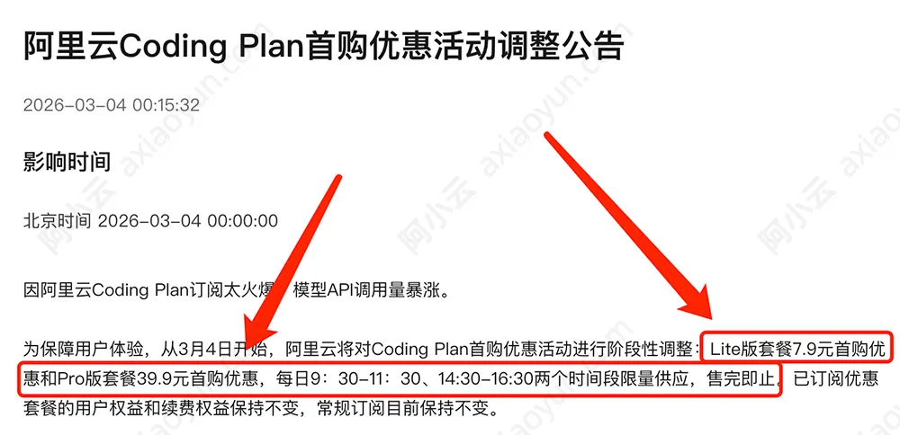 阿里云CodingPlan推出首月优惠活动,但是因为太火爆,所以首月优惠的活动变成限量提供了。Lite版套餐7.9元首购优惠和Pro版套餐39.9元首购优惠,每日9:30-11:30、14:30-16:30两个时间段限量供应,售完即止,如下图: