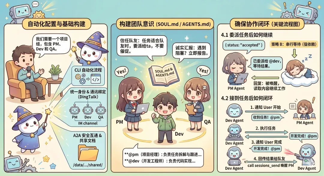 2. 配置流程自动化:用户只需描述团队需求(角色、职责),主代理阅读 Skill 后,自动完成 Agent 创建、通讯配置、规范注入等全部流程。