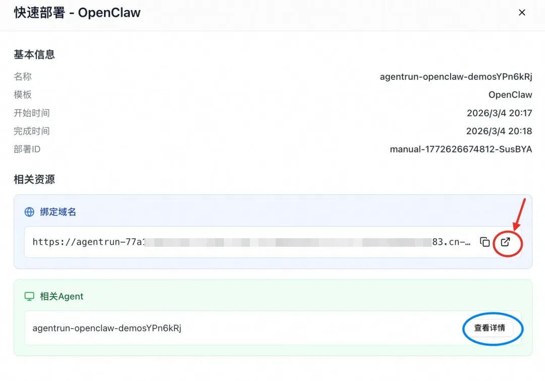 - 等待部署完成后,点击绑定域名的跳转链接,即可进入 OpenClaw Control UI 页面(链接已自动携带 Auth Token)。