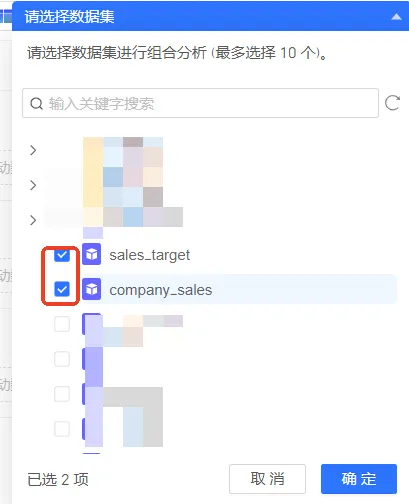 b.在数据集列表中勾选主数据集company_sales和辅助数据集sales_target。