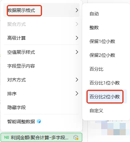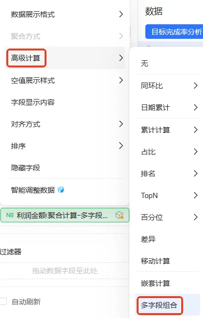 a.单击第二个“利润金额”字段右侧的 图标,依次选择高级计算 > 多字段组合。