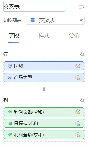 b.在交叉表列中,依次双击或拖入主数据集的“利润金额”字段及辅助数据集的“目标值”字段。其中需要配置两个“利润金额”字段,其中一个将作为后续多字段组合计算的基础。