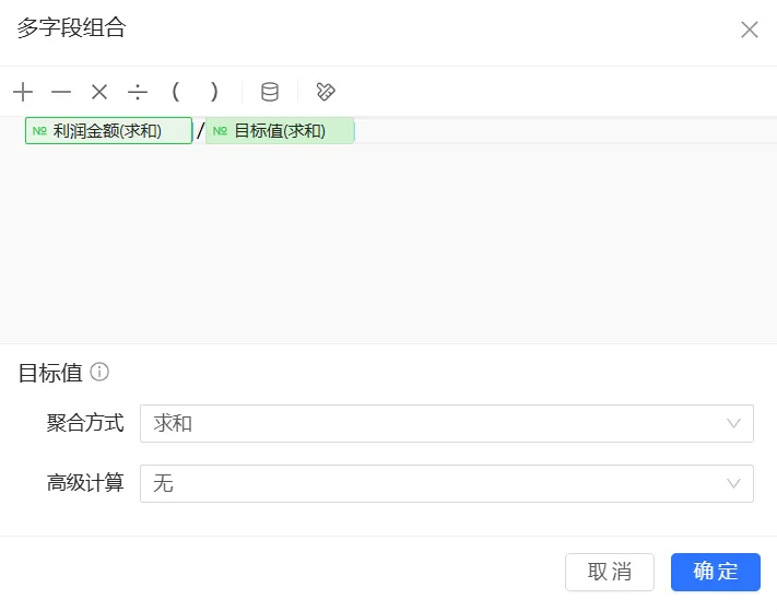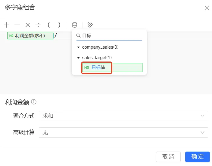 b.在多字段组合弹窗中利润金额字段已被默认填入,点击 图标插入除号。