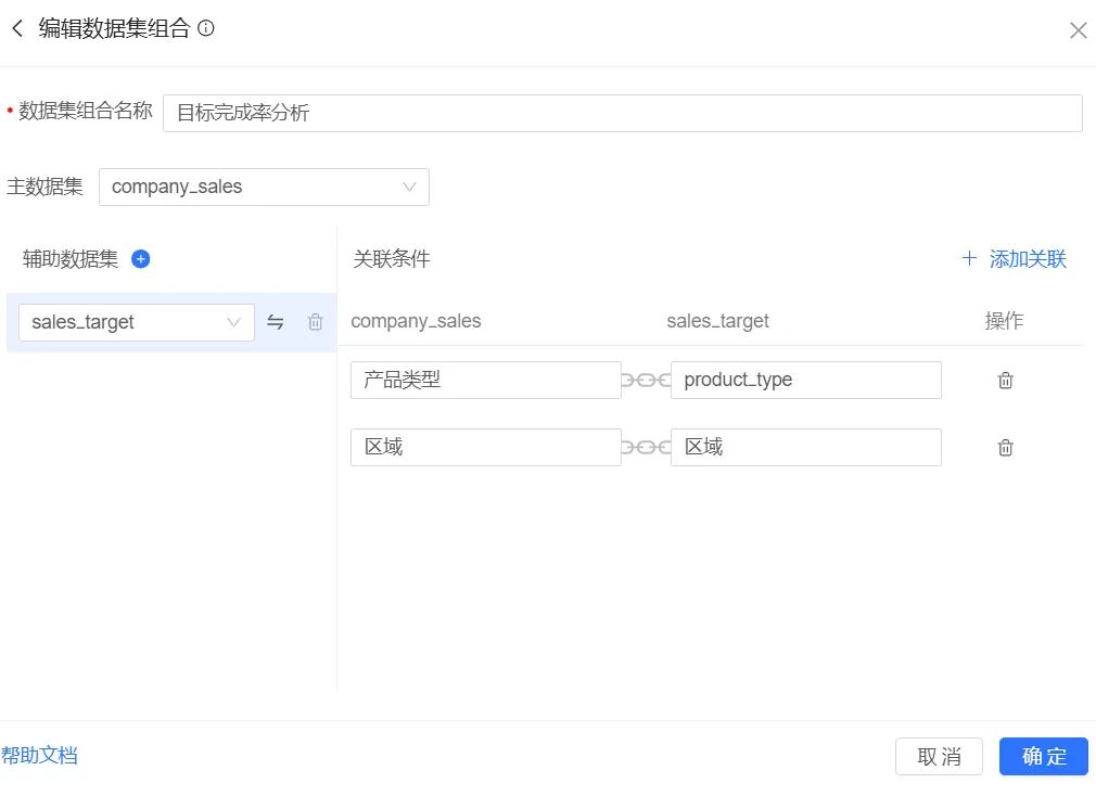 本例中将数据集组合命名为目标完成率分析,以销售订单明细数据集company_sales为主数据集、目标值数据集sales_target为辅助数据集,两者通过“区域”和“产品类型”字段关联。