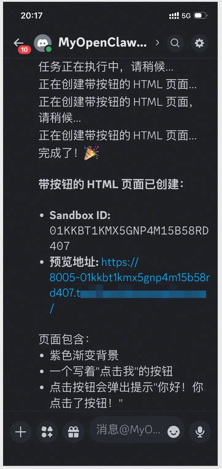 1. 用户向 OpenClaw 发起请求:「帮我写一个带按钮的 HTML 页面并给我预览链接。」