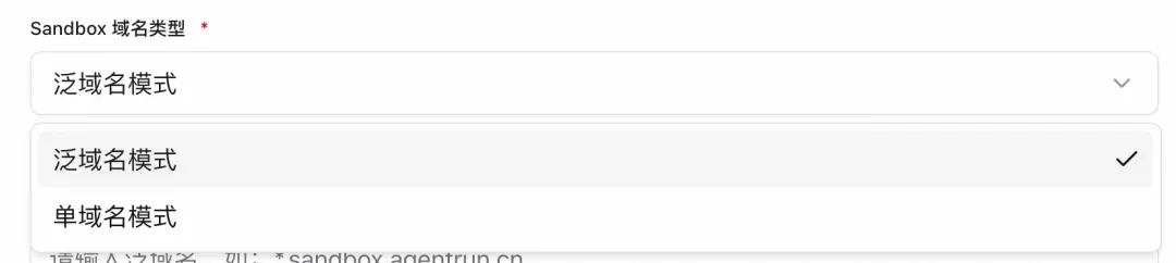 2. 创建 Sandbox 域名:在 AgentRun 控制台创建 Sandbox 域名,选择「泛域名模式」或「单域名模式」,并填写对应域名。