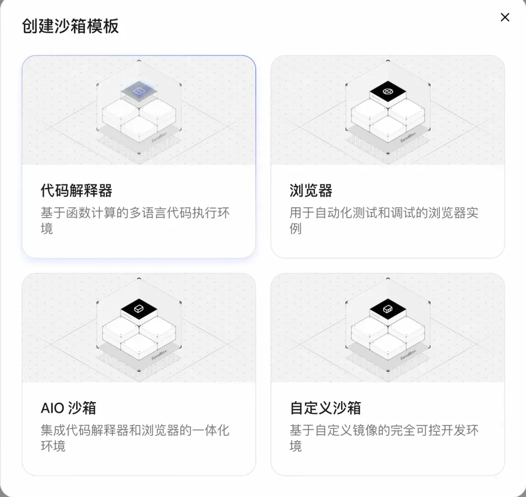 4. 创建沙箱模板:选择模板类型(如「代码解释器」「浏览器」「AIO 沙箱」等),完成模板创建。