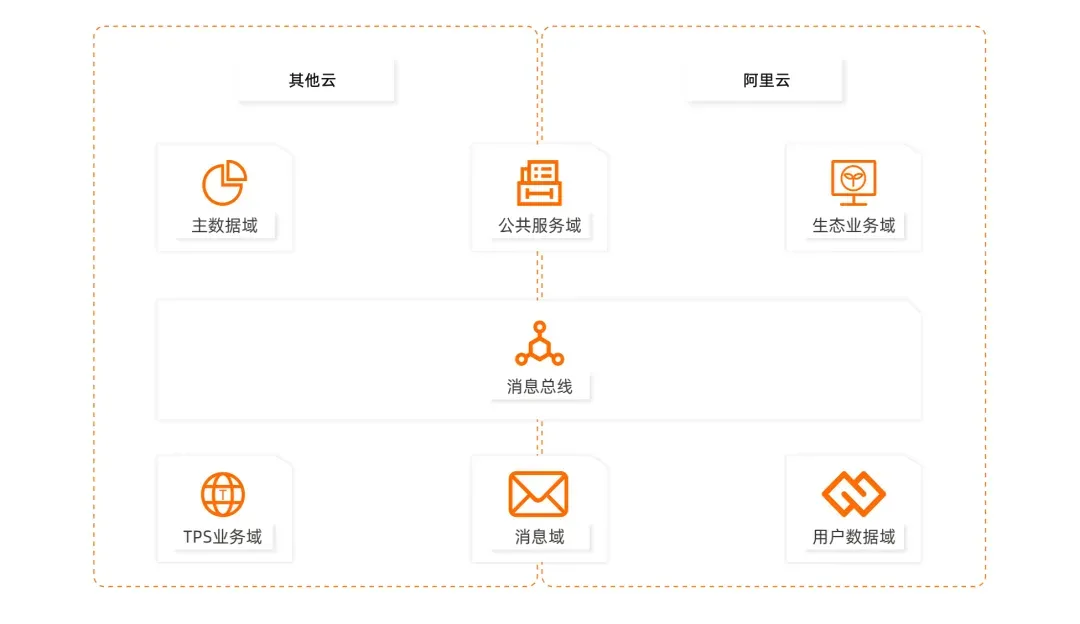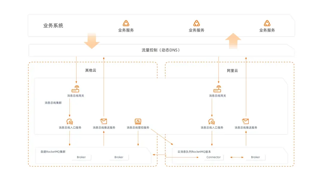 - 消息总线基于其他云和阿里云跨云部署,通过专线通信确保网络可靠性。