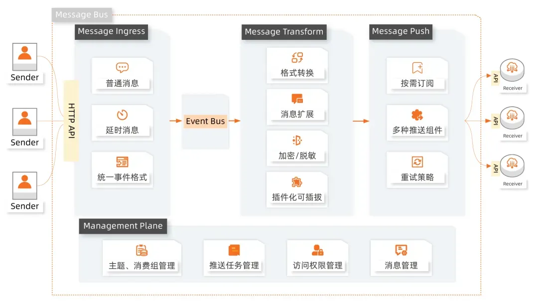 - 标准化接入协议(HTTP):采⽤ HTTP 协议作为统一接入协议,构建标准化的消息⼊⼝和出⼝接⼊点,降低系统接⼊门槛,便于精细化流量管理与控制。