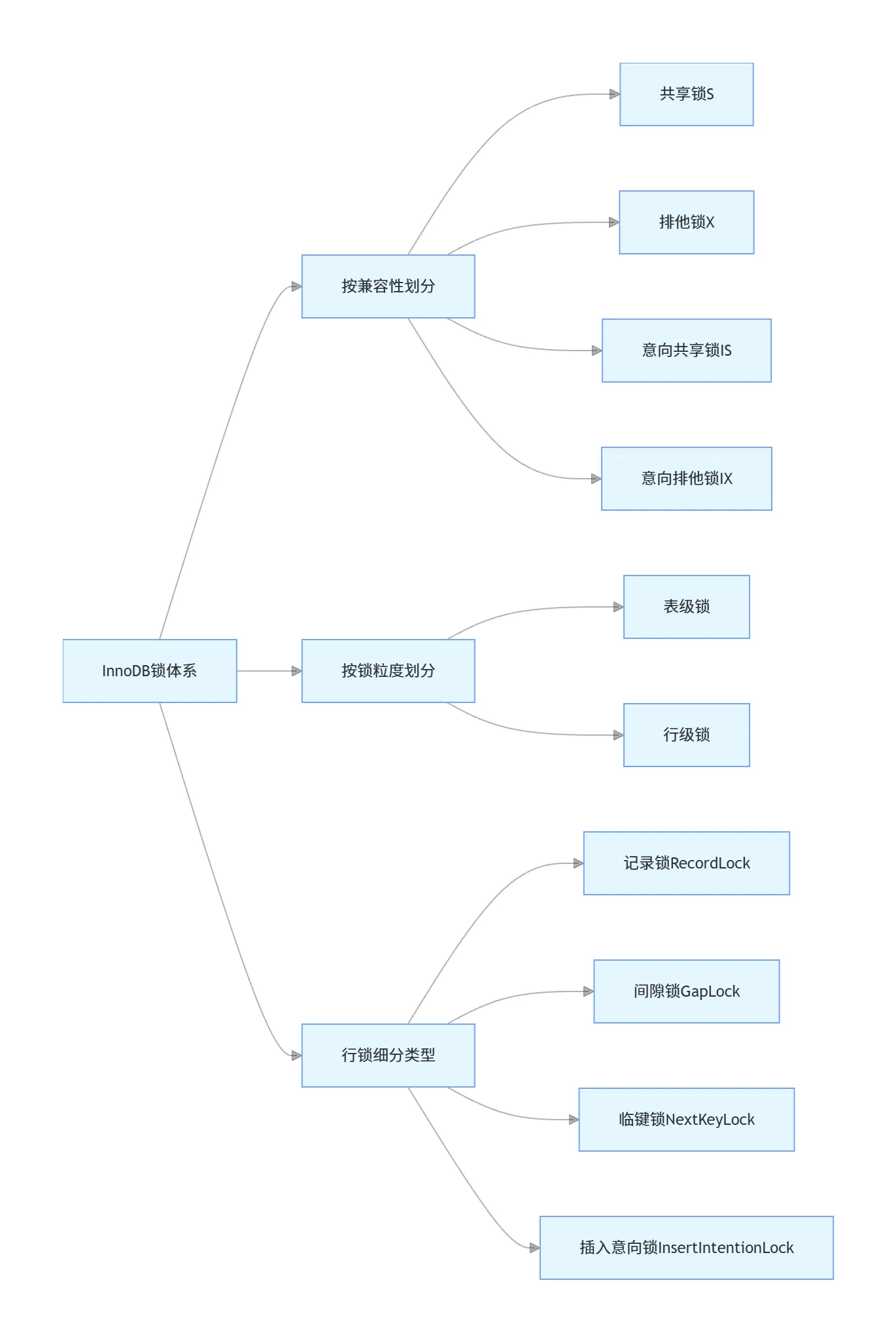 UPDATE/DELETE/INSERT语句会自动加X锁,select ... for update手动加X锁。 - 意向锁(IS/IX) :表级锁,用于快速判断表内是否有行锁,避免全表扫描检查行锁,事务加行锁前必须先加对应的意向锁,意向锁之间互相兼容,仅与表级的S/X锁互斥。