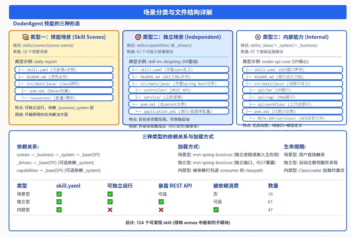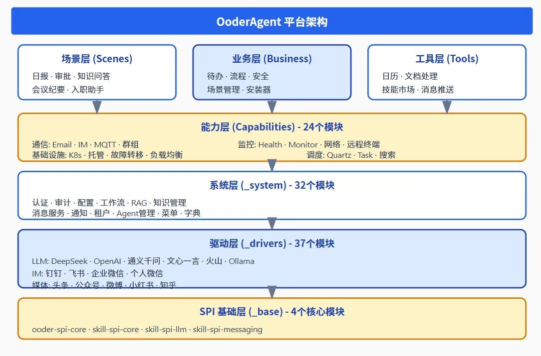 OoderAgent 采用技能即服务(Skills-as-a-Service)架构,将复杂的 AI 能力抽象为可插拔的技能模块: