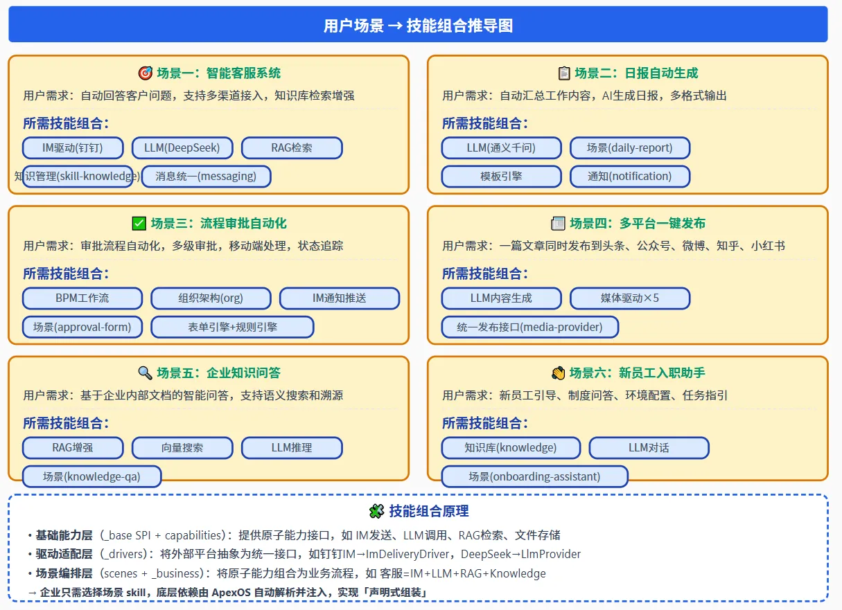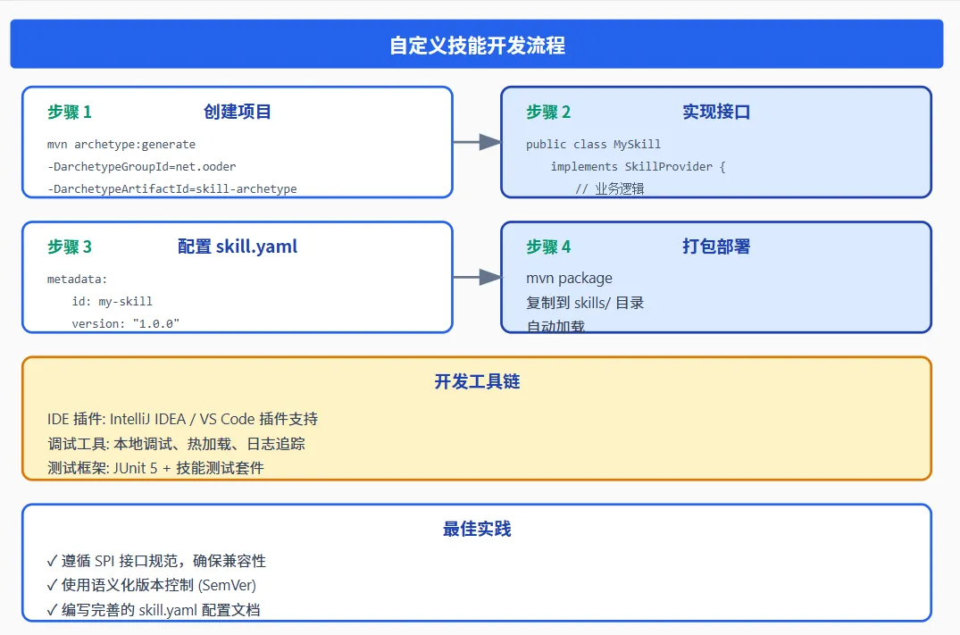 @Servicepublic class MyEnterpriseSkill implements SkillProvider { @Override public Capability getCapability() { return Capability.builder() .id("my-enterprise-skill") .name("企业专属技能") .version("1.0.0") .build(); } @Override public Response execute(Request request) { // 企业业务逻辑 return Response.success(result); }}