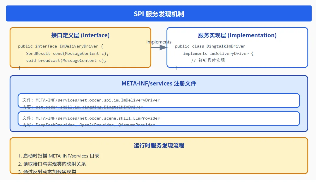 OoderAgent 采用 JDK 标准 SPI(Service Provider Interface)机制实现模块化: