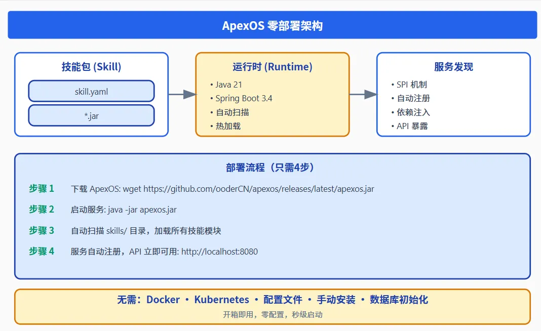 # 下载 ApexOS wget https://github.com/ooderCN/apexos/releases/latest/apexos.jar # 启动(零配置,开箱即用) java -jar apexos.jar # 访问控制台 open http://localhost:8080